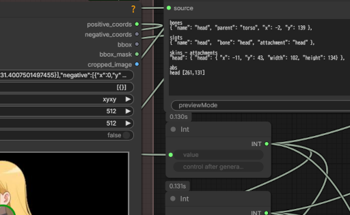 次に素材の切り出し 画像からパーツを切り出すだけだが、これは実に労力が掛かる。 ある程度はやむなしだが全部切り出すのはとても大変だ とにかくそこをどうにかしたい! プロトタイプとしてセグメンテーション判別とボーンの階層構造をjson出力するComfyUIワークフローを組んだ (残念ながらmediapipeによるセグメンテーション検出は実写学習モデルの為アニメ系には使えず)指定範囲を組んでSAMによる検出をUI化して繋ぎ込み、ボーン位置と連動させれば 必要な画像パーツのセグメント検出で自動的に切り抜くという代物だ…しかしこれでもノイズは混ざる